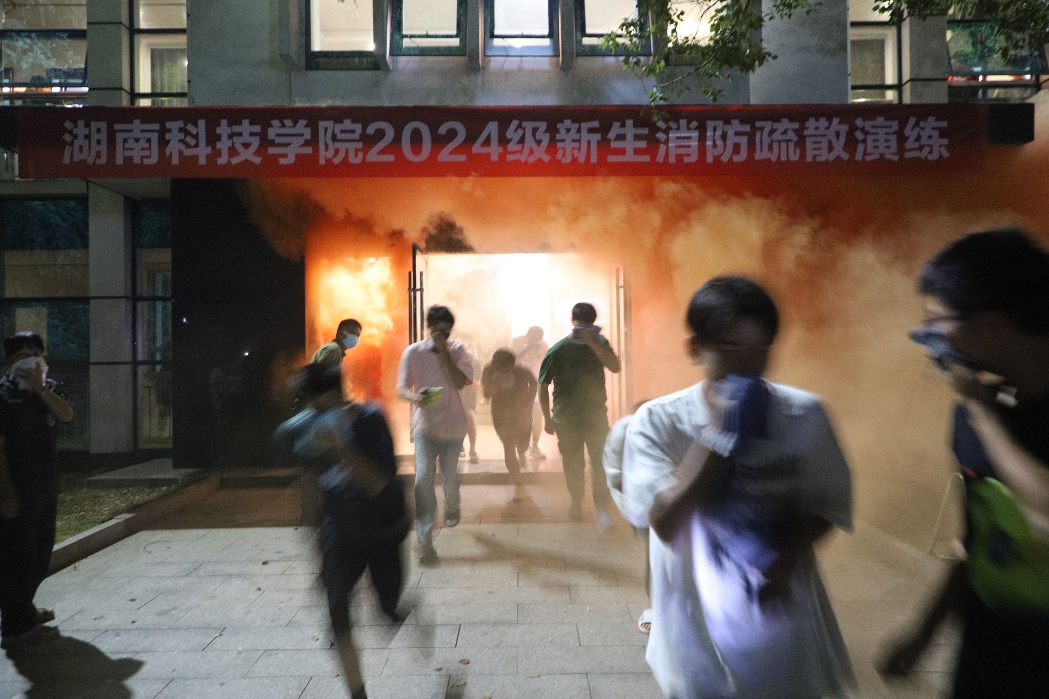 本次演练模拟了从发现宿舍火情、启动应急系统、发布火灾警报到保卫部与消防人员展开扑救、疏散人员的全过程。在演练过程中,宿舍楼的参演学生从所在楼层的两边沿中间楼梯移动,低头、用衣物或手帕等布料沾水护住口鼻,有序沿右手边下楼离开火场,到集结点集合。演习结束后,还组织学生开展了室外消防水带连接的培训和比赛。