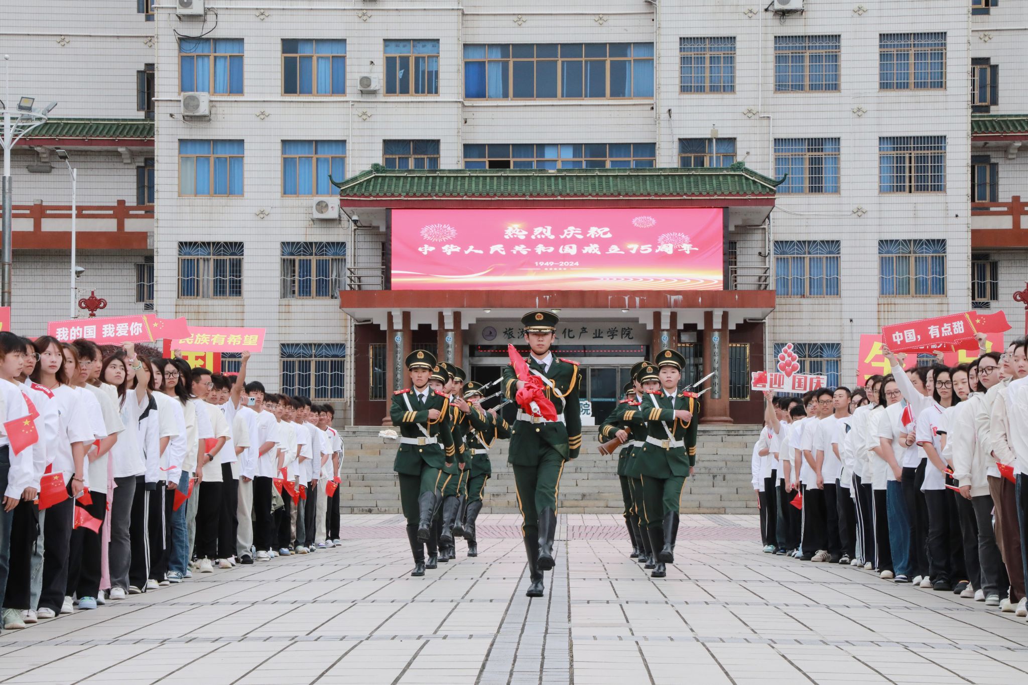学校党委副书记、校长黄创霞在讲话中指出,重温75年的光辉岁月,强国征程波澜壮阔,沧桑巨变举世瞩目。在庆祝中华人民共和国成立75周年之际举行升旗仪式,抒发对伟大祖国的崇敬和热爱,坚定接续前行的信心和决心,具有特别重要的意义。他还对全体师生提出三点希望,一是牢记习近平总书记的嘱托,立报国强国大志向、做挺膺担当奋斗者。希望同学们做坚定的青年马克思主义者,努力学习知识技能,不断提升人文素养,自觉树立和践行社会主义核心价值观,追求更有高度、更有境界、更有品位的人生;二是牢记习近平总书记的教诲,弘扬教育家精神,争做新时代大先生。希望老师们时刻牢记“为党育人、为国育才”的初心使命,爱岗敬业,关爱学生,努力培养德智体美劳全面发展的社会主义建设者和接班人;三是牢记习近平总书记的指示,履职尽责担使命,做改革创新引领者。学校广大党员干部要认真学习贯彻习近平总书记关于教育的重要论述和全国教育大会精神,聚焦服务“三高四新”战略定位和使命任务,不断提高服务地方经济社会发展能力,加快推动学校“内涵发展、特色发展、跨越发展”。