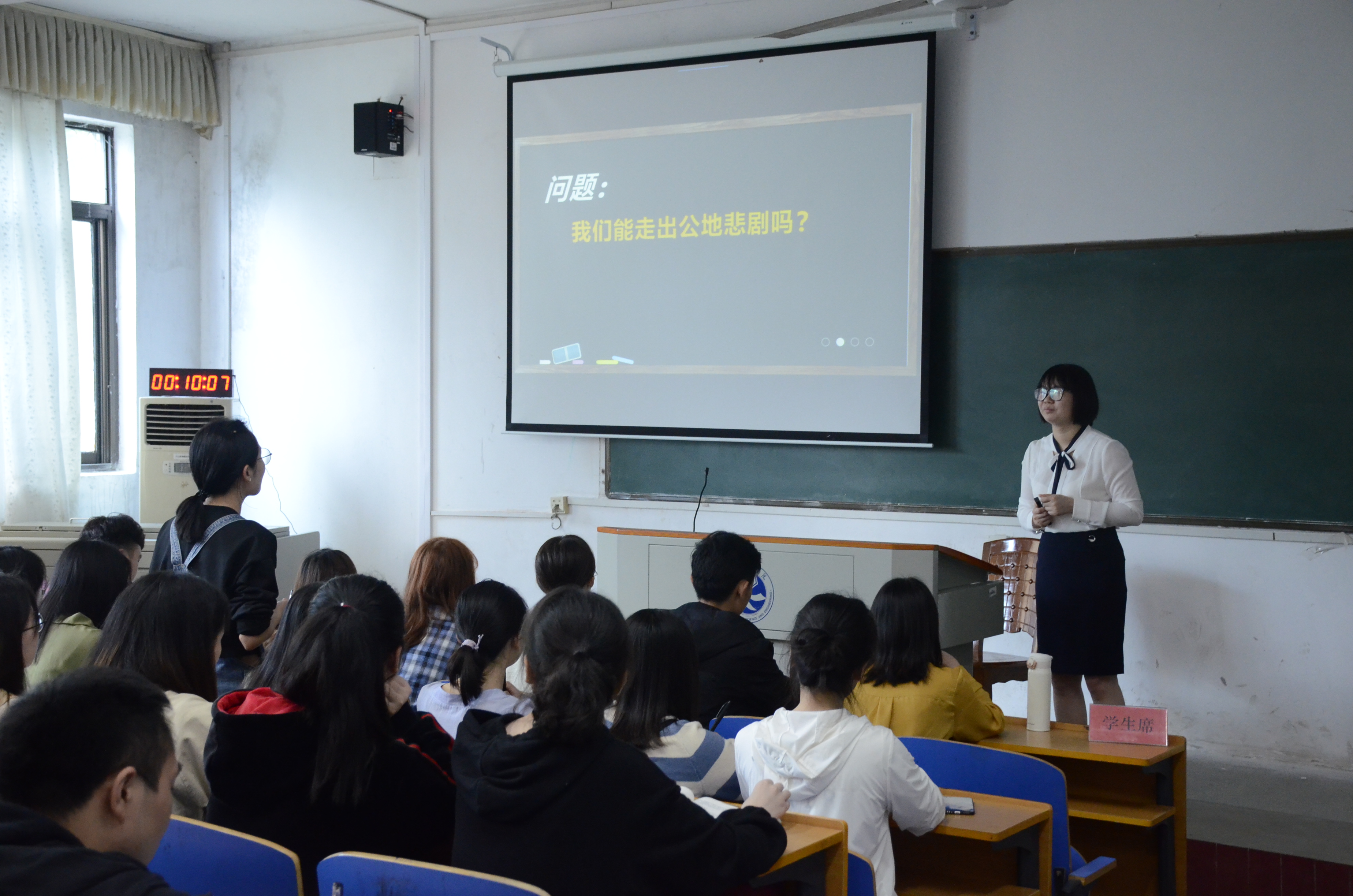 在比赛过程中,老师与学生积极互动,现场气氛十分热烈。电子与信息工程学院邵金侠老师以《通信原理》为主讲内容从基本场景(天气预报)应用出发,以通俗易懂的形式,展开基本差错控制思想的介绍和讨论,将通信和生活密切地联系在一起。理学院黄燕平老师以《弯曲程度问题和曲率》为主讲内容从生活中遇到的限速问题导入新课,给出了曲率的概念和计算方法,最后用西班牙火车脱轨事件说明要重视弯曲程度问题,在弯曲程度较大的路段一定要限速!外国语学院彭璐老师通过实例向学生普及日本传统婚礼仪式常识,两名学生现场为大家展示了日本最受年轻人欢迎的神前式婚礼特有的敬酒礼节。马克思主义学院杨艳姣老师以《人是万物之灵的奥秘》为主讲内容,用人类在飞机、载人潜水器、高铁等方面取得的成就为例,激发学生对人的主观能动性的深入思考。