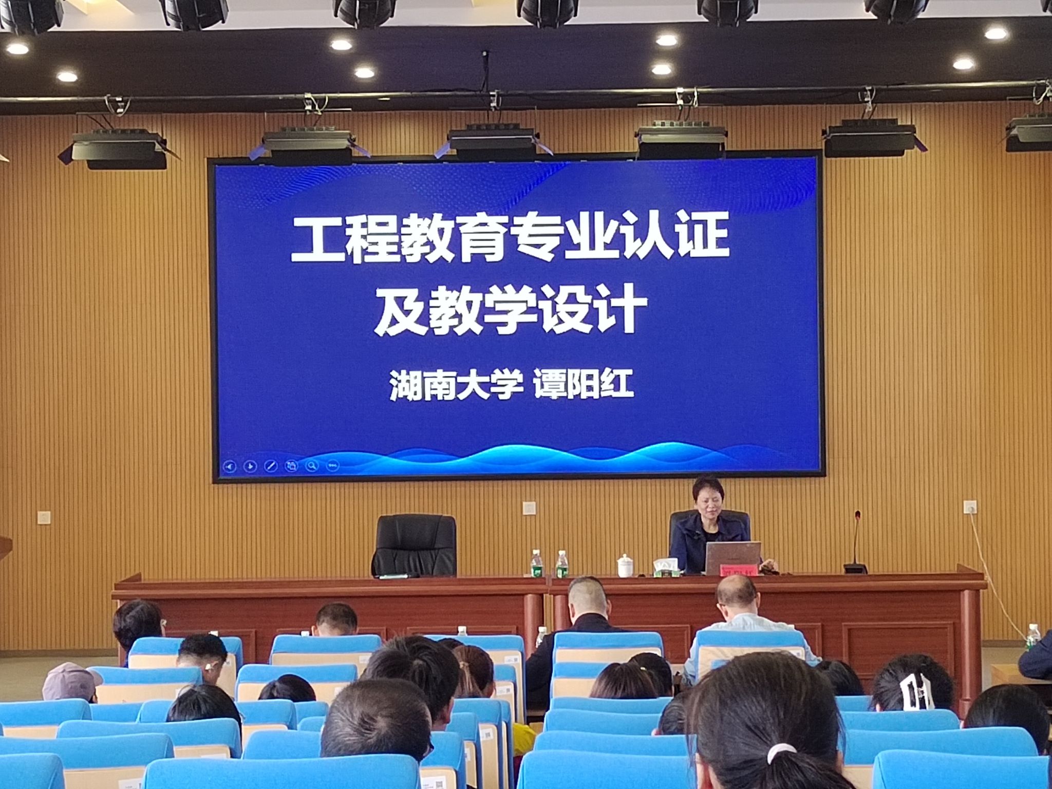 本次培训特邀“全国宝钢优秀教师”湖南大学谭阳红教授担任主讲嘉宾。培训围绕如何以OBE理念支撑教学设计展开,谭阳红教授向参会人员深入浅出地介绍了OBE理念的内涵和要求,展示了各大名校的课堂设计案例以及分享她与学生的互动教学。谭阳红教授特别强调教师在教学设计过程中要以学生为中心,紧跟时代发展,关注学生能力的培养,将学生的发展情况作为持续改进的依据,形成“评价——反馈——改进”的闭环。