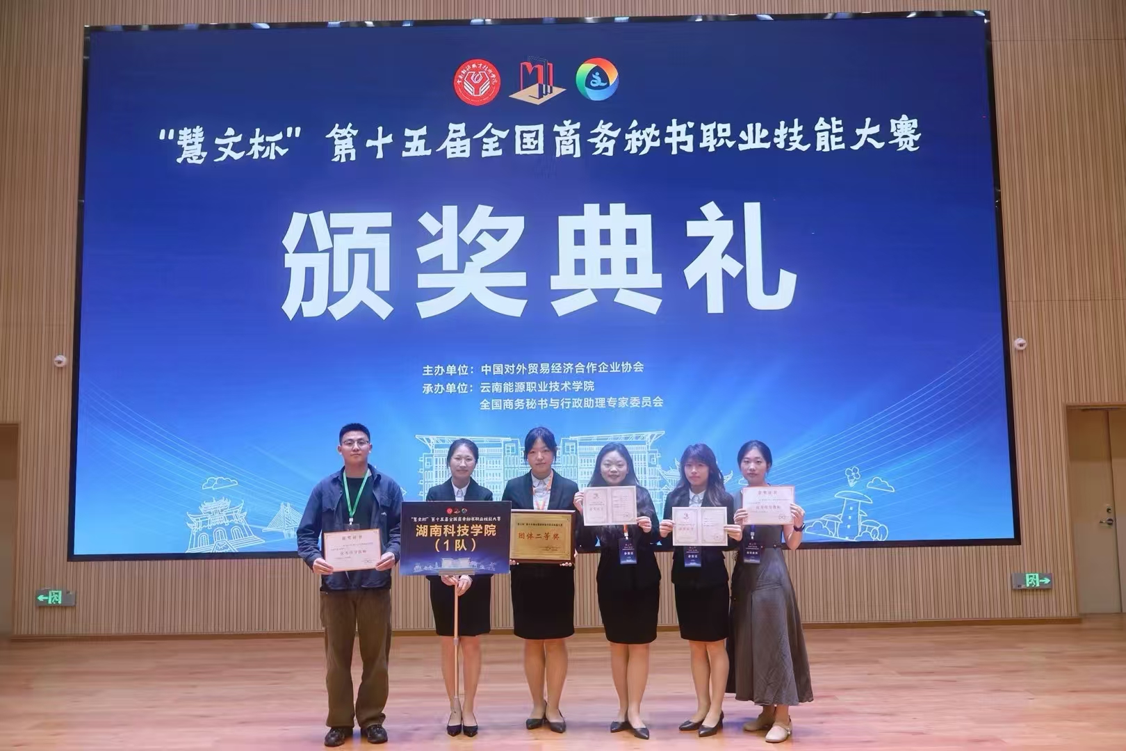 本网讯(通讯员 张紫妍)近日,“慧文杯”第十五届全国商务秘书职业技能大赛在云南曲靖举办。在beat365文法学院谷显明、尹华君、曾芳、宋艳旭、何建良、莫顺斌等老师的指导下,由范庆奇、周雯老师带队,秘书专业学生张紫妍、余鑫熠、谭晶、董依岚同学组成的参赛队伍凭借扎实的专业功底和出色的现场发挥,在本次大赛中荣获团体二等奖,董依岚同学斩获秘书专项事务处理个人三等奖的优异成绩。