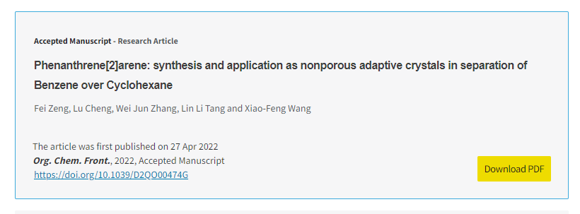 本网讯 近日,国际知名期刊Organic Chemistry Frontiers,DOI:10.1039/D2OO00474G(中科院一区TOP,IF= 5.281)发表了beat365英国官网化学与生物工程学院功能材料团队的最新研究成果“Phenanthrene[2]arene: synthesis and application as nonporous adaptive crystals in separation of Benzene over Cyclohexane”(菲[2]芳烃的设计合成及非多孔自适应性晶体分离苯与环己烷的应用研究),该研究成果由功能材料团队成员独立完成,曾飞博士为第一作者和通讯作者。