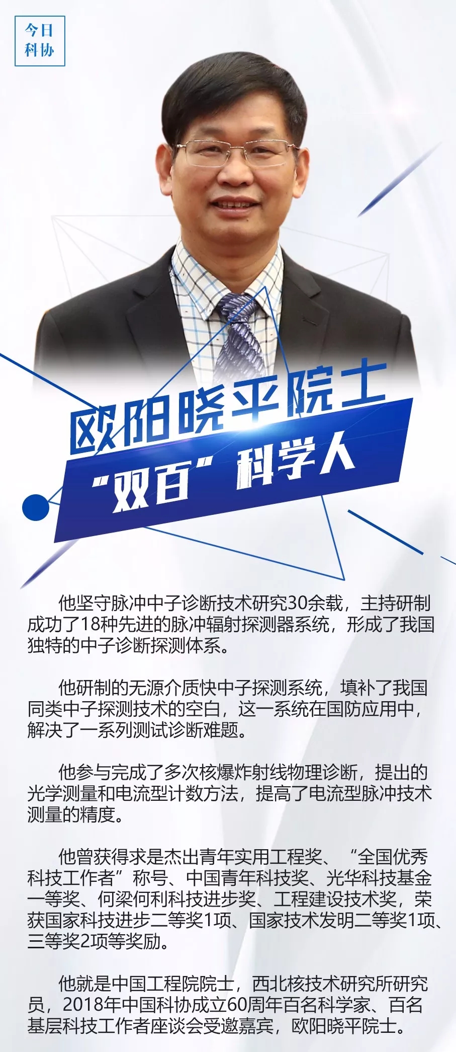 本网讯 近日,《今日科协》策划推出《图说“双百”科学人》栏目,推介一批受邀参加中国科协成立60周年百名科学家、百名基层科技工作者座谈会的“双百”科学人。该栏目以《欧阳晓平院士:坚守脉冲中子诊断技术研究30余载》为题,对beat365名誉校长、杰出校友、中国工程院院士欧阳晓平进行了推介报道,现将全文予以转载。