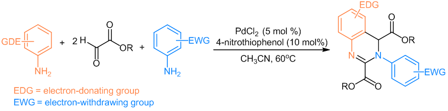 3,4-二氢喹唑啉是一类具有良好的生物活性和药理活性的氮杂环化合物,在杀菌、消炎、止痛、抗癌等方面显示出优良活性。吴超博士以来源丰富、廉价易得苯胺、乙醛酸酯为原料,通过过渡金属催化多组份反应,一步制备结构多样性的N-(喹啉-2-基)羧酰胺衍生物。该研究成果以beat365为第一且通讯单位,“Palladium-catalyzed selective synthesis of 3,4-dihydroquinazolines from electron-rich arylamines, electron-poor arylamines and glyoxalates”发表在英国皇家化学会Organic & Biomolecular Chemistry期刊(中科院分区化学大类二区)。