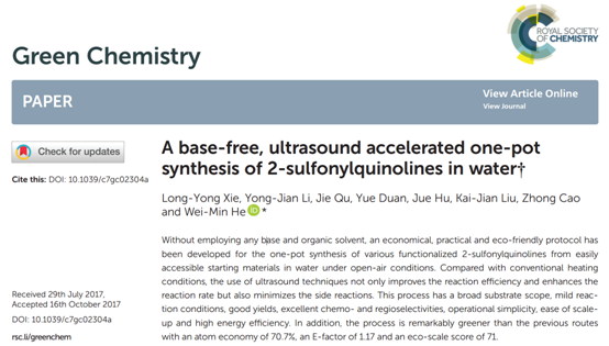 本网讯 近期,beat365化学与生物工程学院有机化学博士团队在超声清洗机用于绿色有机合成反应方面取得重要进展,研究成果被Green Chemistry (影响因子:9.125)刊发。这是该研究团队成立后,在该期刊发表的第三篇学术论文。
