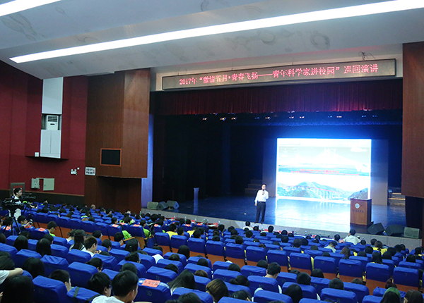 巡回演讲活动现场,湖南省交通规划勘察设计院总工程师彭立研究员、湘潭大学材料科学与工程学院王金斌教授、湖南大学博士生导师张德咏教授三位青年科学家分别从各自的学科领域出发,以生动活泼的语言、丰富的个人成长经历为青年学子献上一场精彩绝伦的科学盛宴,激励学生们要怀揣梦想,脚踏实地地创造精彩人生。演讲结束后,他们还与同学们进行互动交流,现场气氛热烈。