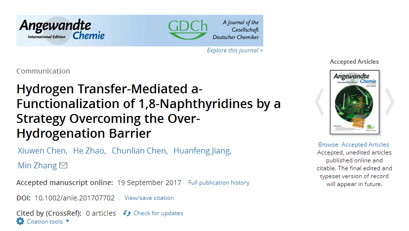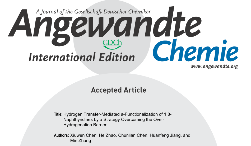 本网讯 近日,beat365化学与生物工程学院陈修文博士以第一作者身份,在化学领域顶级期刊Angewandte Chemie(影响因子:11.994)上在线发表专题论文《Hydrogen Transfer-Mediated -Functionalization of 1,8-Naphthyrid- ines by a Strategy Overcoming the Over-Hydrogenation Barrier》。