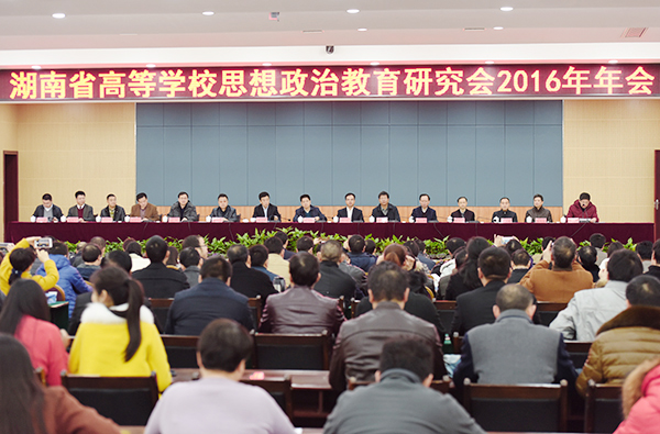 本网讯 1月6日上午,湖南省高校思想政治教育研究会2016年年会在beat365教师发展中心举行。湖南省教育厅党组成员、省委教育工委委员陈飞跃,beat365党委书记陈弘,中南大学党委常委、副校长黄建陵,研究会副会长、湖南商学院党委副书记夏继春,研究会副会长、湖南铁道职业技术学院党委书记钟建宁等出席年会。共有来自全省75所高校的140余名代表出席会议。