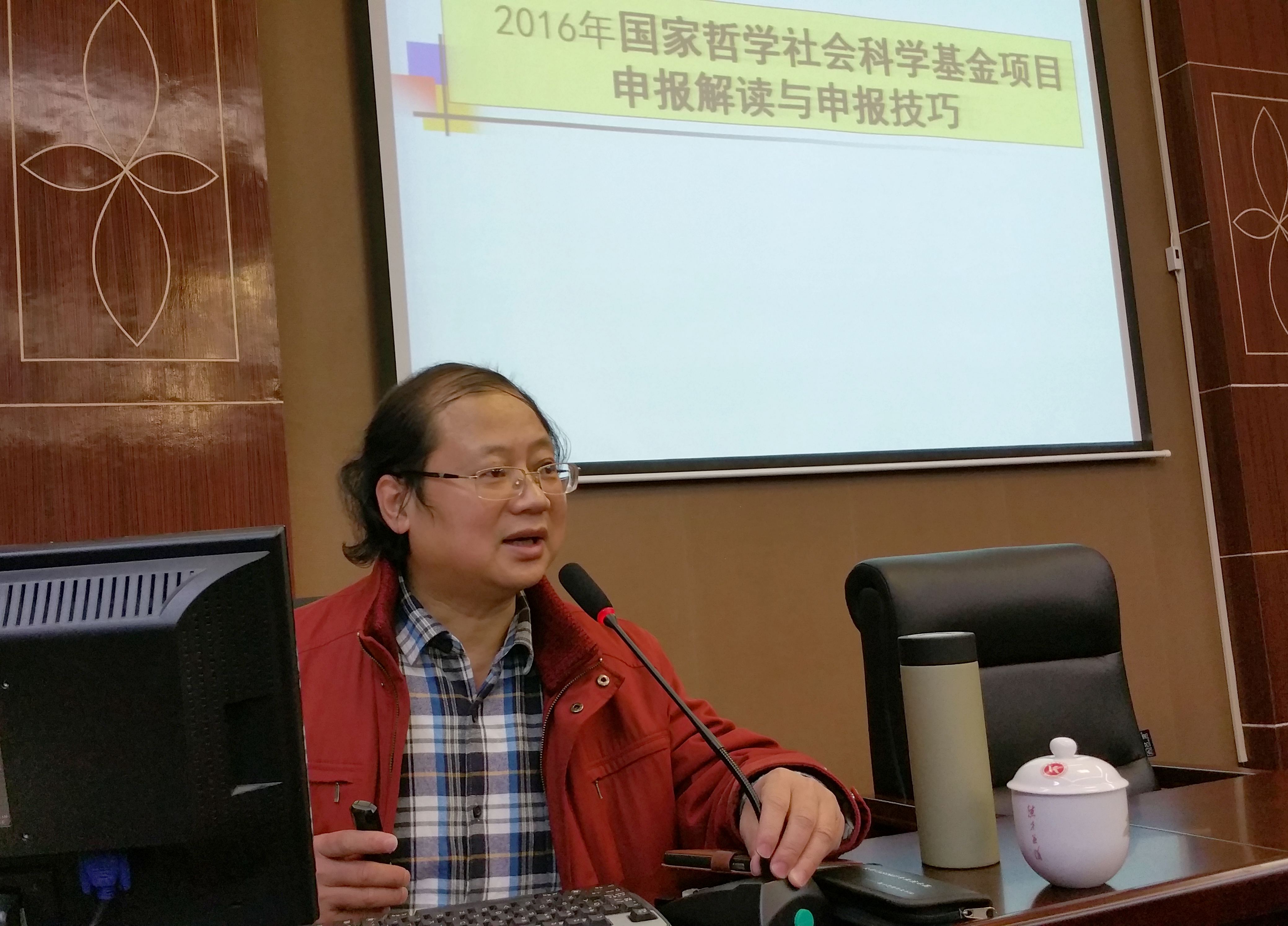 莫道才教授以其三次获得国家社科基金课题(重大项目1项,普通项目2项)的立项经验,为beat365作2016年国家哲学社会科学基金项目申报指导。他指出,项目的选题要尽量与申报指南紧扣起来,要突出地方、民族、学科特点,要充分考虑课题组成员的前期成果,要有时代感,要贴近理论前沿,要有全国性意义,要与自己研究领域紧密相关。他还向大家传授了项目论证的技巧,并指出了申报书中常见的问题。他还就《2016年度国家社会科学基金项目申报公告》进行了深入解读。
