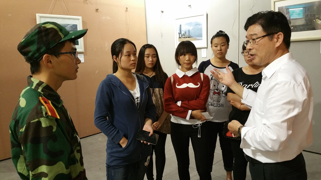 慕名而来的师生络绎不绝,学校原副校长欧小松教授饶有兴致观看了摄影作品展。宋宏福耐心地为师生讲解:“这是一个翻越障碍物的实践课,需要翻越障碍物的同学是蒙着眼的,同学只能告诉他前面有什么障碍物,蒙眼者只能是借助一根棍子慢慢试探”,“这是一个课堂讨论,大家可以分别提出不同意见和建议,最后一起探讨出最佳方案”,“很多地方都提供了桌子和椅子,大家随时可以坐下来讨论交流,吃饭的时也是交流的很好时机”,“这是背靠背式的交流互动”,“习近平主席访问澳大利亚时,我也组织和参与了欢迎活动”……