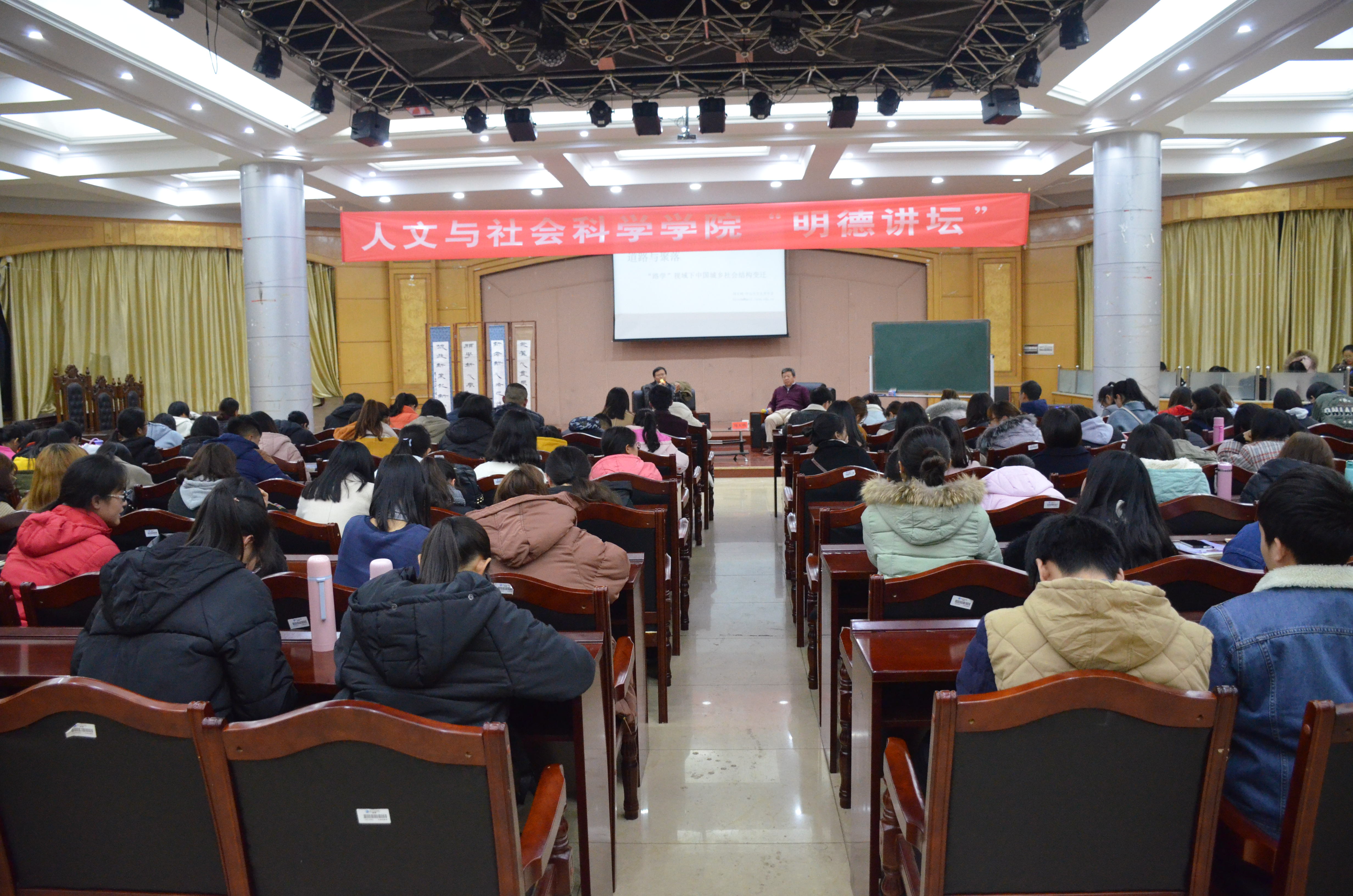 本网讯  12月3日晚,人文与社会科学学院在明德楼举办“明德讲坛”第五讲“道路与聚落”,邀请教育部长江学者特聘教授、中山大学博士生导师周大鸣教授担任本期主讲嘉宾,为师生讲授“路学”视域下的中国城乡社会结构变迁,该院院长潘雁飞教授主持本次讲坛。