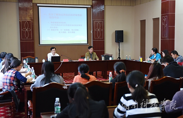 刘晓敏指出,要提高社科评审项目申报的成功率,必须要做到有的放矢,他就社科评审工作三个方面中的若干问题进行了详细说明:一是要充分了解和运用省社科评审委员会的项目平台。做到熟悉掌握有关信息,了解省社科评审委的四大职能,把握好时间节点,提前准备。二是在研究成果方面要做精学术类,突出应用类,紧贴时代需求。学术类的成果应有原创性、创新性、特色性;应用类成果要服务中心、把握热点、注意时段、突出对策。三是要大力加强优长、特色学科及团队建设,只有好的人才队伍,才能出高质量的成果,加强资源整合对成功申报有着重要的作用。