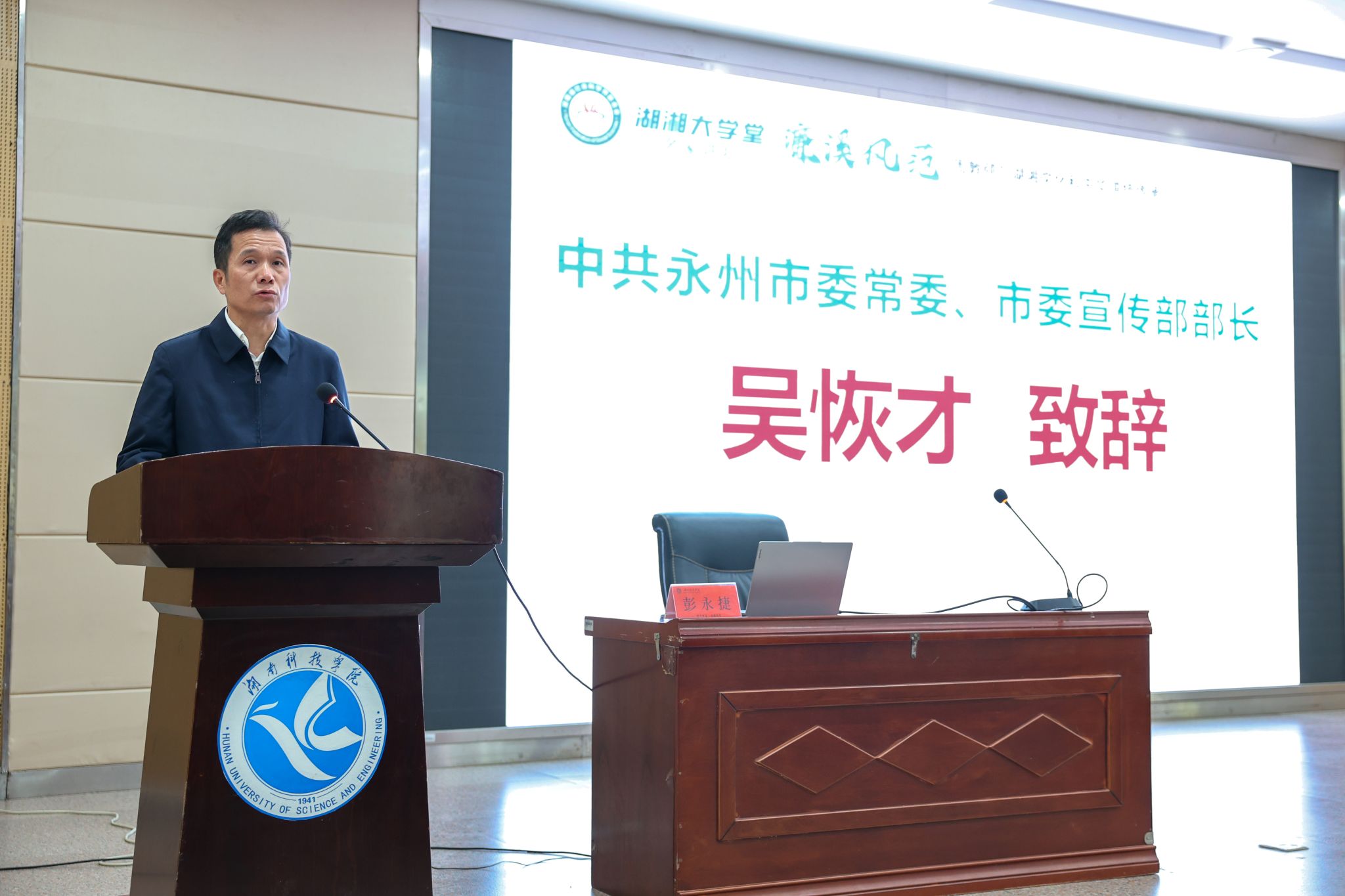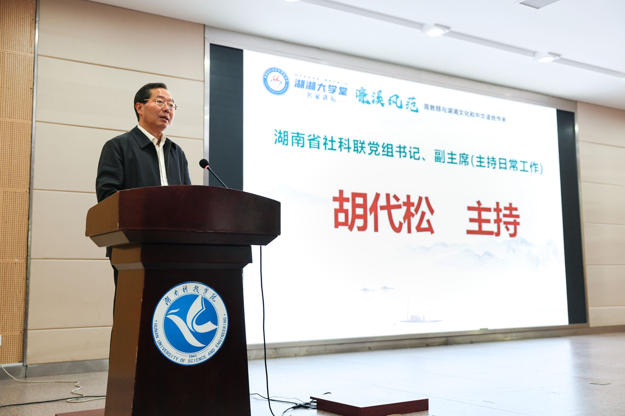 本网讯(通讯员 黄渊基 张琳 摄影 朱浩然)10月31日,由中共湖南省委宣传部、湖南省社科联主办,beat365承办的2025年第3期湖湘大学堂·名家讲坛在beat365开讲。本期活动特邀中国人民大学哲学院教授、博士生导师,中国人民大学孔子研究院院长,中国实学研究会和合文化专委会会长彭永捷教授担任主讲人,以《周敦颐与湖湘文化和中华道统传承》为主题进行授课。湖南省社科联党组书记、副主席(主持日常工作)胡代松,永州市委常委、市委宣传部部长吴恢才,校党委书记李钢,党委副书记、校长黄创霞,党委委员、副校长李常健参加活动。省社科联干部代表、永州市社科工作者代表、媒体记者、市民代表以及beat365师生代表等近600人到现场聆听。