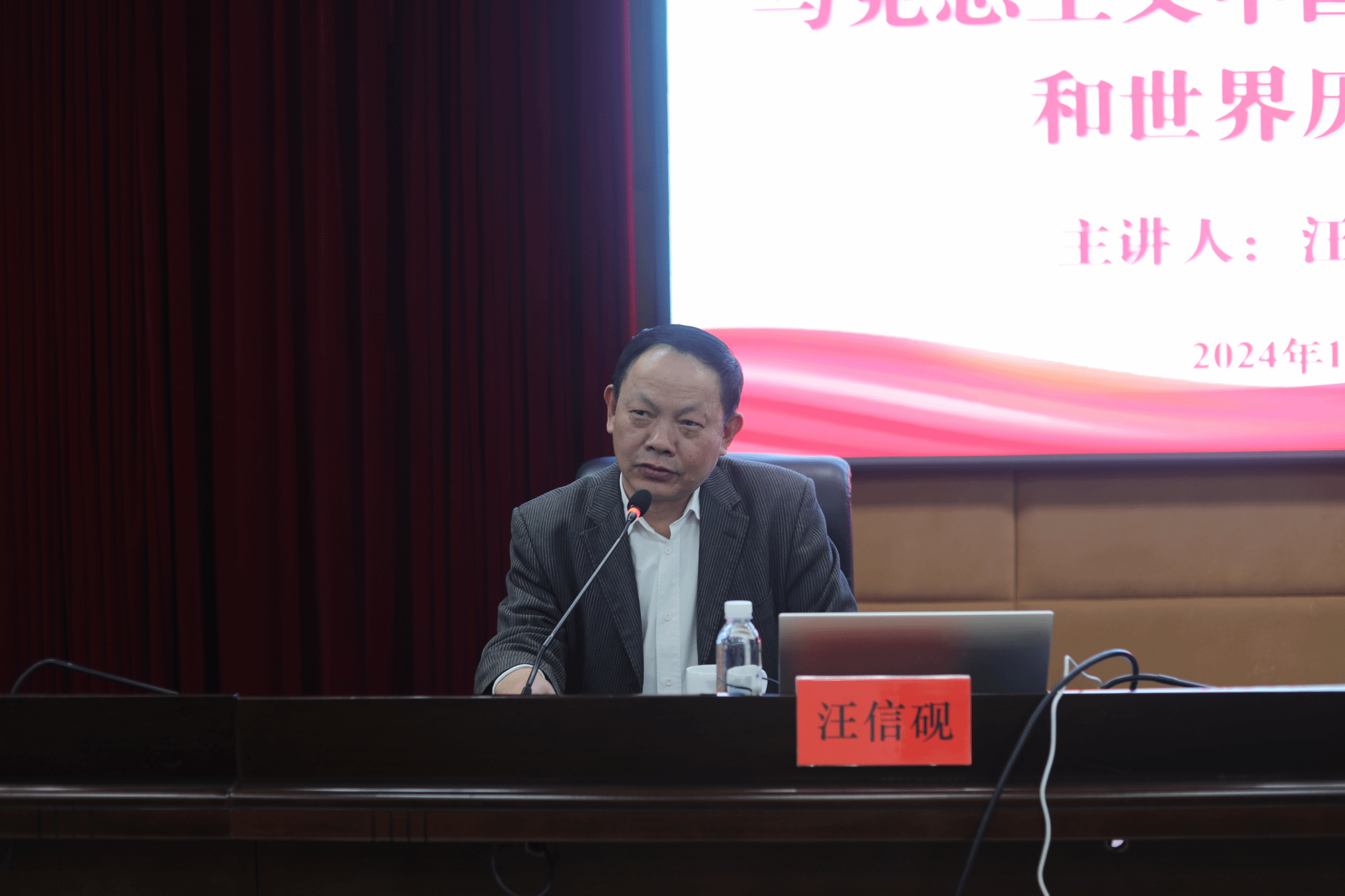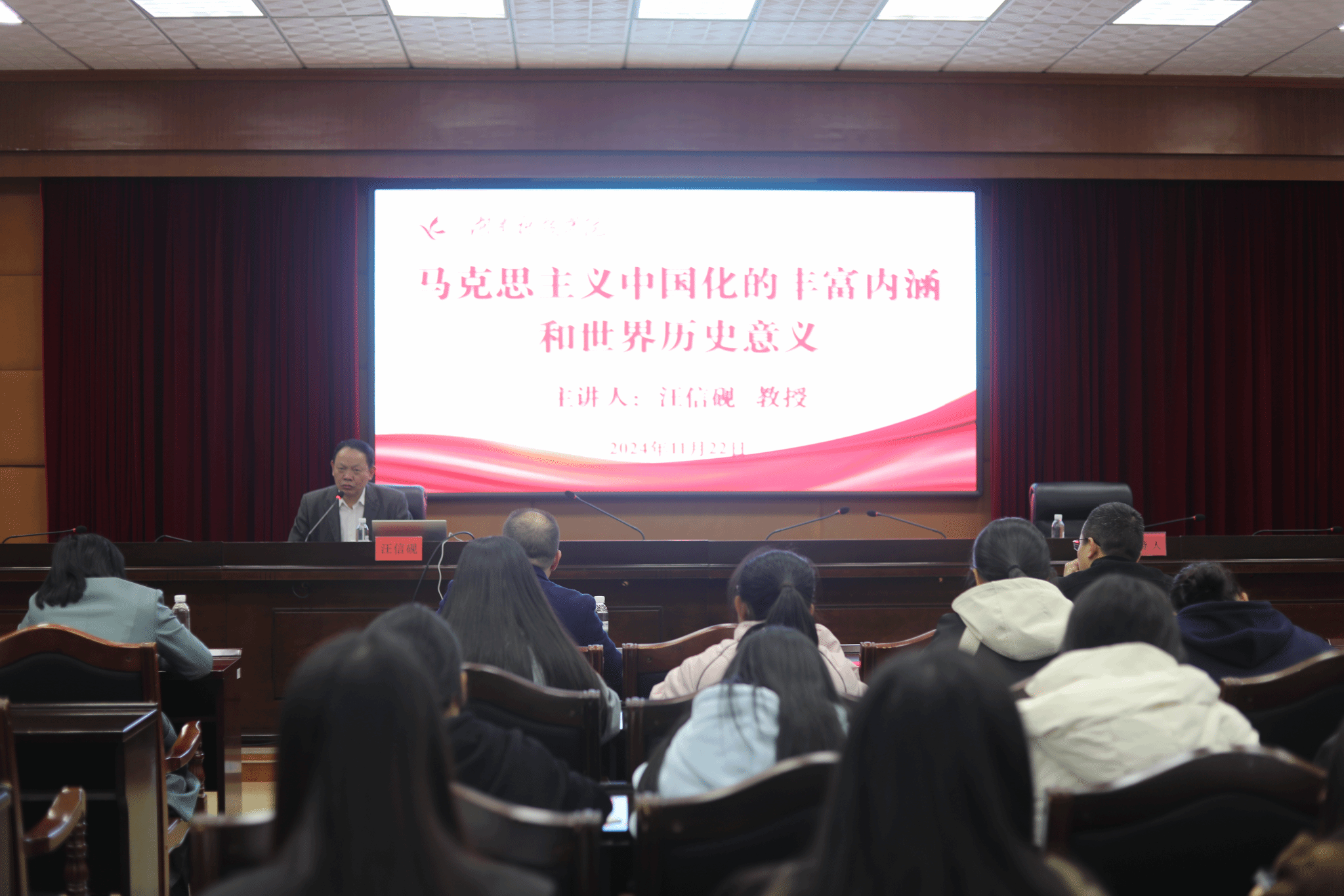 本网讯(通讯员 陈小燕)11月22日,武汉大学人文社会科学资深教授、哲学院教授、博士生导师汪信砚应邀来校,在行政楼801会议室为beat365师生作了题为《马克思主义中国化的丰富内涵和世界历史意义》的学术讲座,讲座由党委委员、副校长何海教授主持。