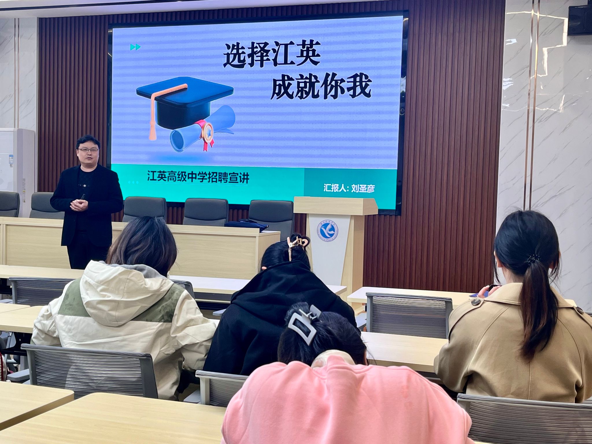 会上,招聘负责人刘圣彦老师详细介绍了安化县江英高级中学的办学环境、办学成果、办学理念、待遇福利、岗位需求以及面试形式等。在交流环节,同学们就入职时间、培训晋升、住宿情况、公积金缴纳比例、课程工作量等问题展开提问,刘老师一一进行了细致详尽的解答。参加宣讲会的同学们积极投递简历,近30名同学参加笔试和面试,最终7名优秀学子与安化县江英高级中学签订了三方就业协议。