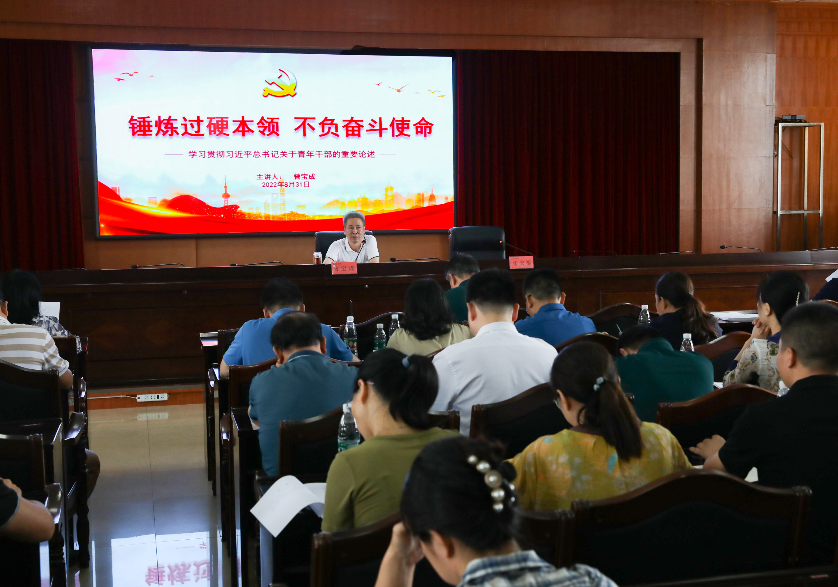 曾宝成以《锤炼过硬本领,不负奋斗使命》为题,结合生动的案例、深刻的理论,针对学习贯彻习近平总书记关于青年干部的重要论述,从“习近平总书记情牵青年干部”、“切实把思想和行动统一到习近平总书记关于青年干部的重要论述上来”、“深入学习领会习近平总书记对中青年干部提出的新要求,努力成为可堪大用、能担重任的栋梁之才。