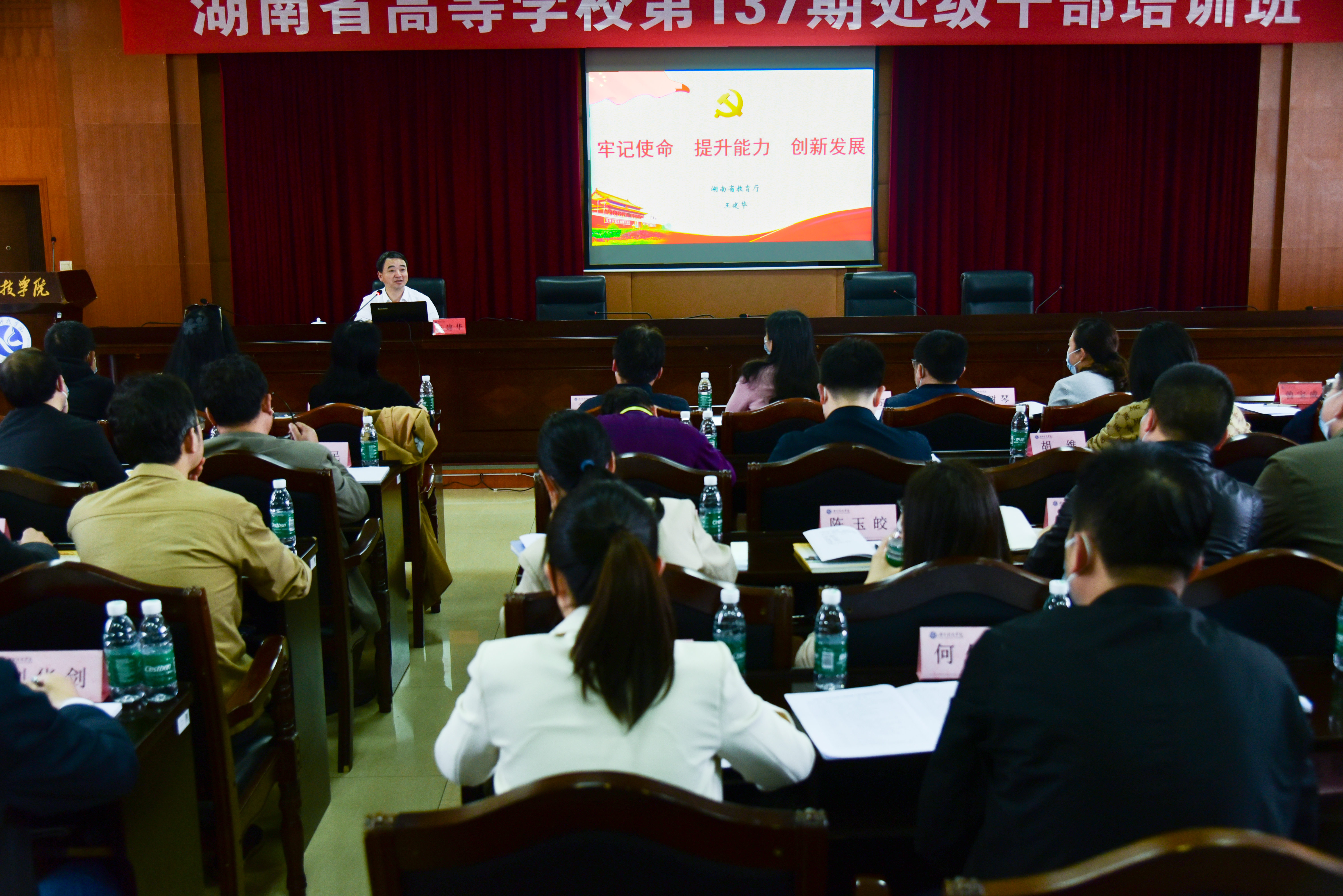 王建华以《牢记使命 提升能力 创新发展》为题给全体学员带来了生动的第一课,紧密结合个人学习体会和工作实践,从学深悟透、牢记使命,提升能力、增强本领,担当作为、创新发展等三个方面,全面系统解读了十九届六中全会精神、习近平总书记关于教育的重要论述、在考察调研湖南期间对教育工作的论述和指示、在2020年秋季学期中央党校(国家行政学院)中青年干部培训班开班仪式上的重要讲话,勉励学员们在不断学习和实践中,提高政治能力、调查研究能力、科学决策能力、改革攻坚能力、应急处突能力、群众工作能力、抓落实能力。他强调,干部是推动学校事业发展的重要力量。全体学员们要不忘初心、牢记使命,以“功成不必在我”的精神境界和“功成必定有我”的历史担当,发扬“钉钉子”精神,发挥“主人翁”作用,把个人发展融入到学校事业发展之中,在校党委行政的坚强领导下,科学谋划好学校发展、争创一流品牌高校,强化忠诚干净担当、抓好班子队伍建设,健全规章制度、推进规范管理,坚持党建引领、夯实基层基础,助推学校高质量发展。