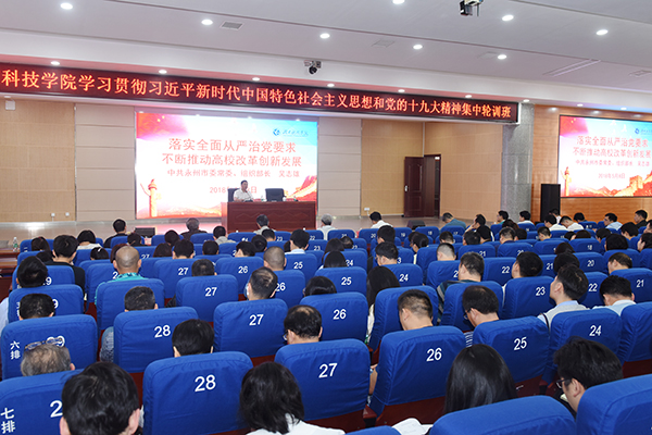 本网讯  5月8日下午,学校举行学习贯彻习近平新时代中国特色社会主义思想和党的十九大精神集中轮训班暨党委理论学习中心组2018年第三次集中学习,本次学习活动特邀永州市委常委、组织部长吴志雄来校作“落实全面从严治党新要求 不断推动高校改革创新发展”的专题辅导报告。党委书记陈弘主持。校长曾宝成及全体校领导,学校党委理论学习中心组成员,副科级以上干部,全体教职工党员参加学习。