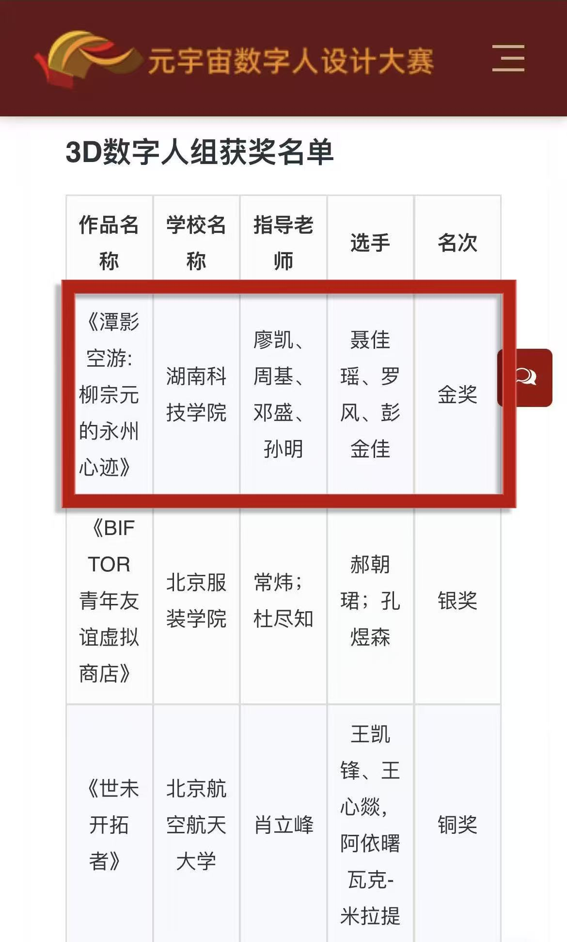 本网讯(通讯员 王星怡)近日,2025年全国大学生计算机应用能力与数字素养大赛落幕,beat365土木与环境工程学院智能建造系参赛团队依托砖石质文物智慧化保护利用技术湖南省重点实验室,凭借原创作品《潭影空游:柳宗元的永州心迹》从全国众多参赛队伍中脱颖而出,成功摘得元宇宙数字人设计赛道3D数字人组金奖。