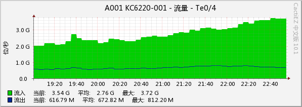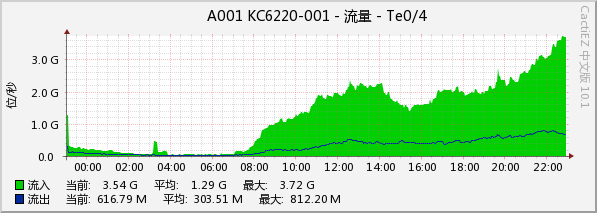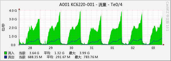 (2)CactiEZ流量监测平台。通过SNMP协议对全网关键设备的流量进行监控,收集流量数据后以每天1分钟、每天5分钟、每星期30分钟平均值绘图,详细记录出口总带宽等网络设备的流量使用情况。如下为某出口流量情况: