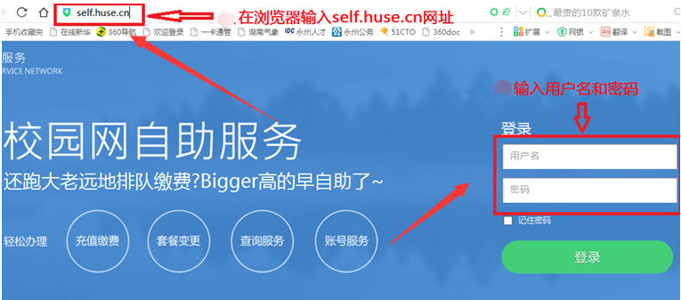 1)打开浏览器,在地址栏输入self.huse.cn回车,输入用户名(工号)和密码(身份证后六位)点后进行登录,如图1.1所示: