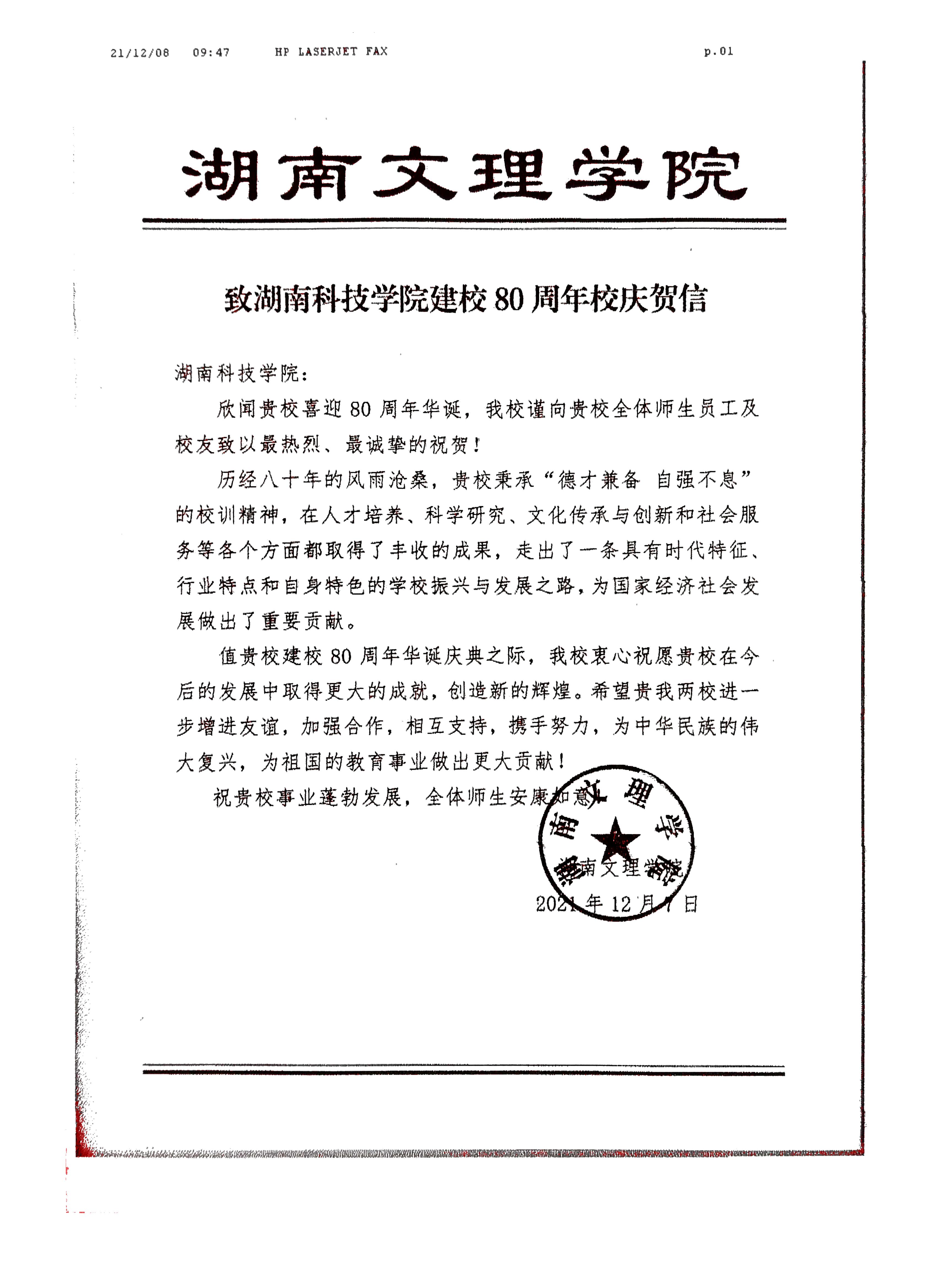 20211208给beat365英国官网校庆的贺信(湖南文理学院)