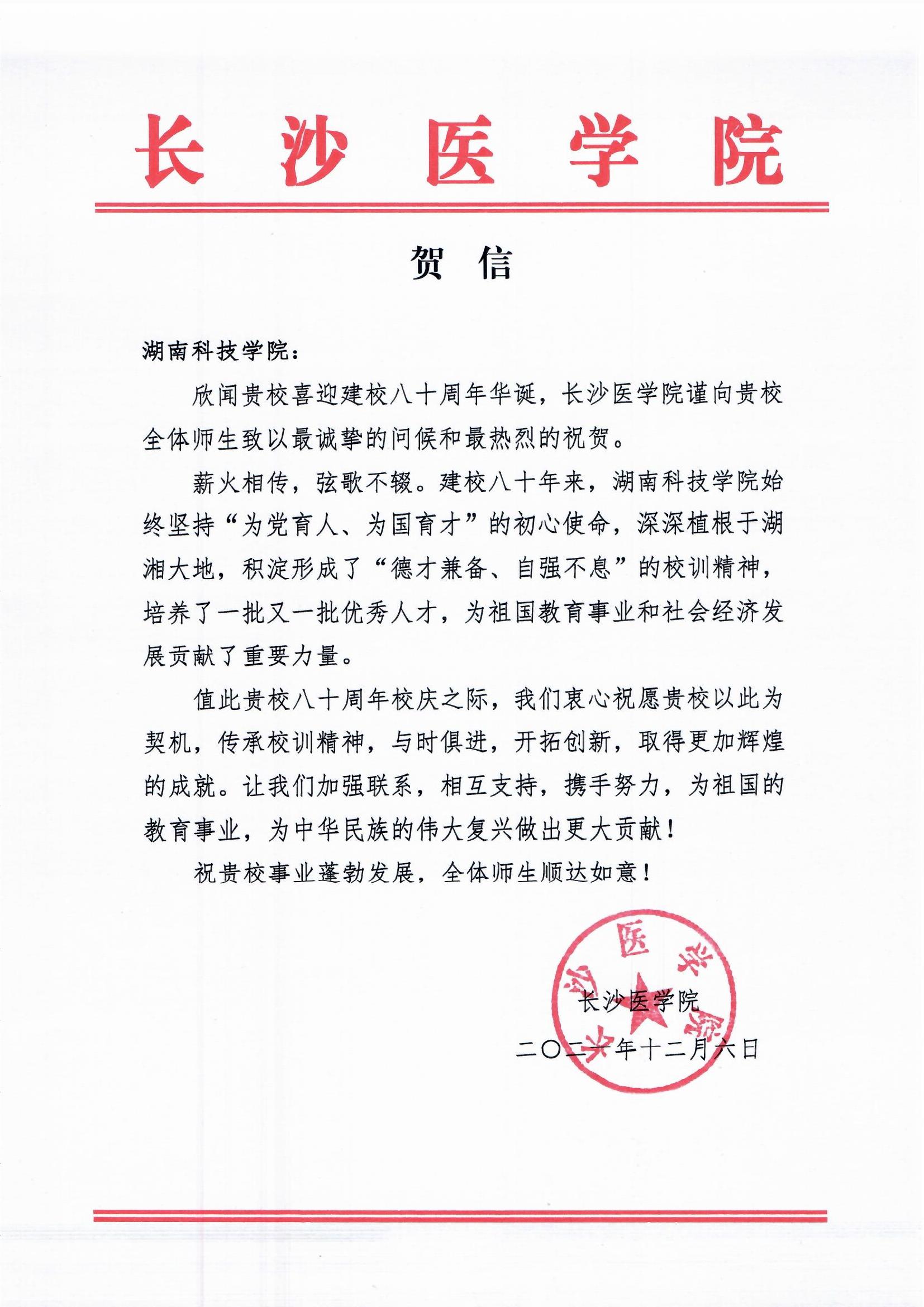 20211206给beat365英国官网校庆的贺信(长沙医学院)