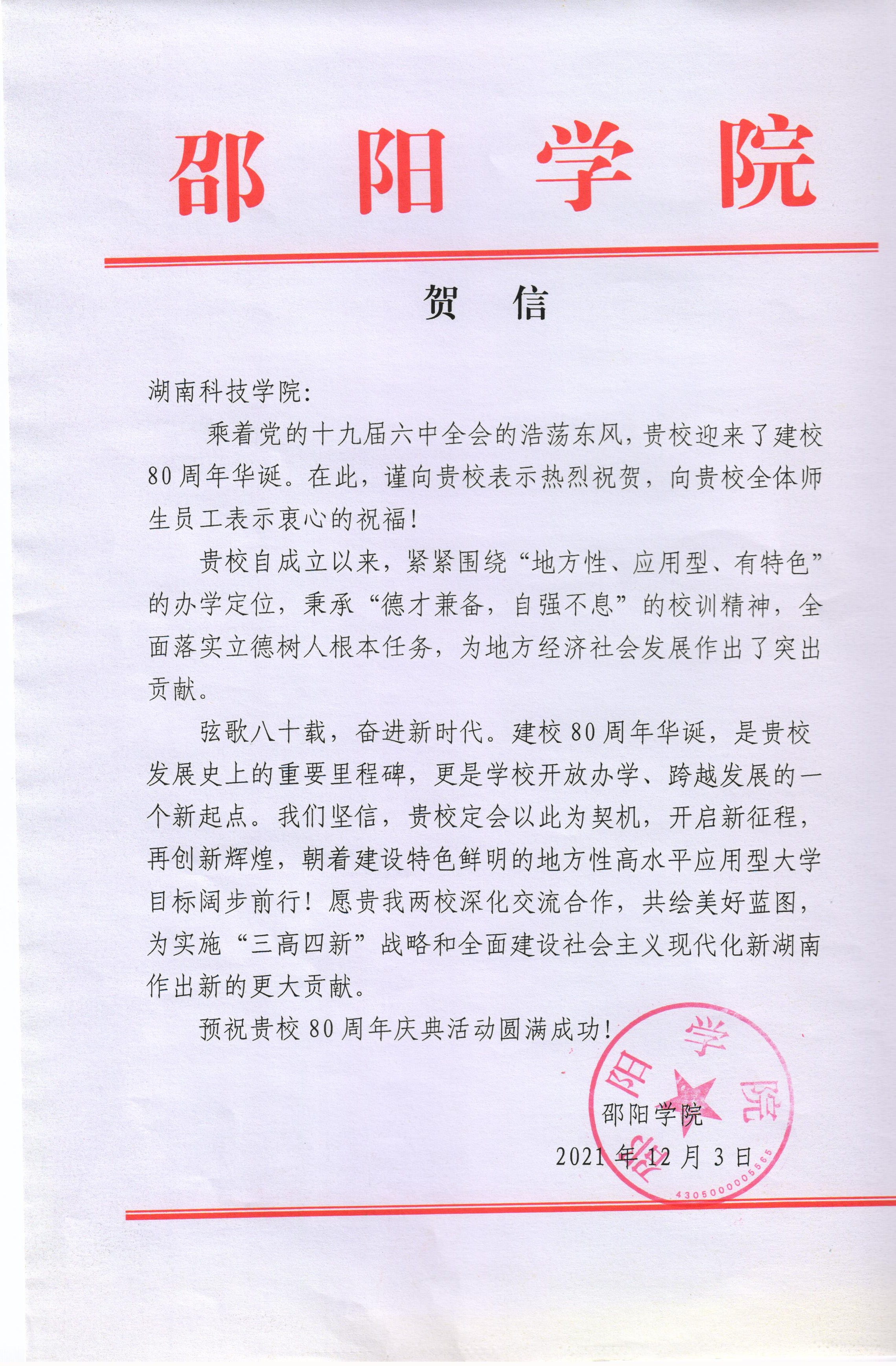 20211203给beat365英国官网校庆的贺信(邵阳学院)