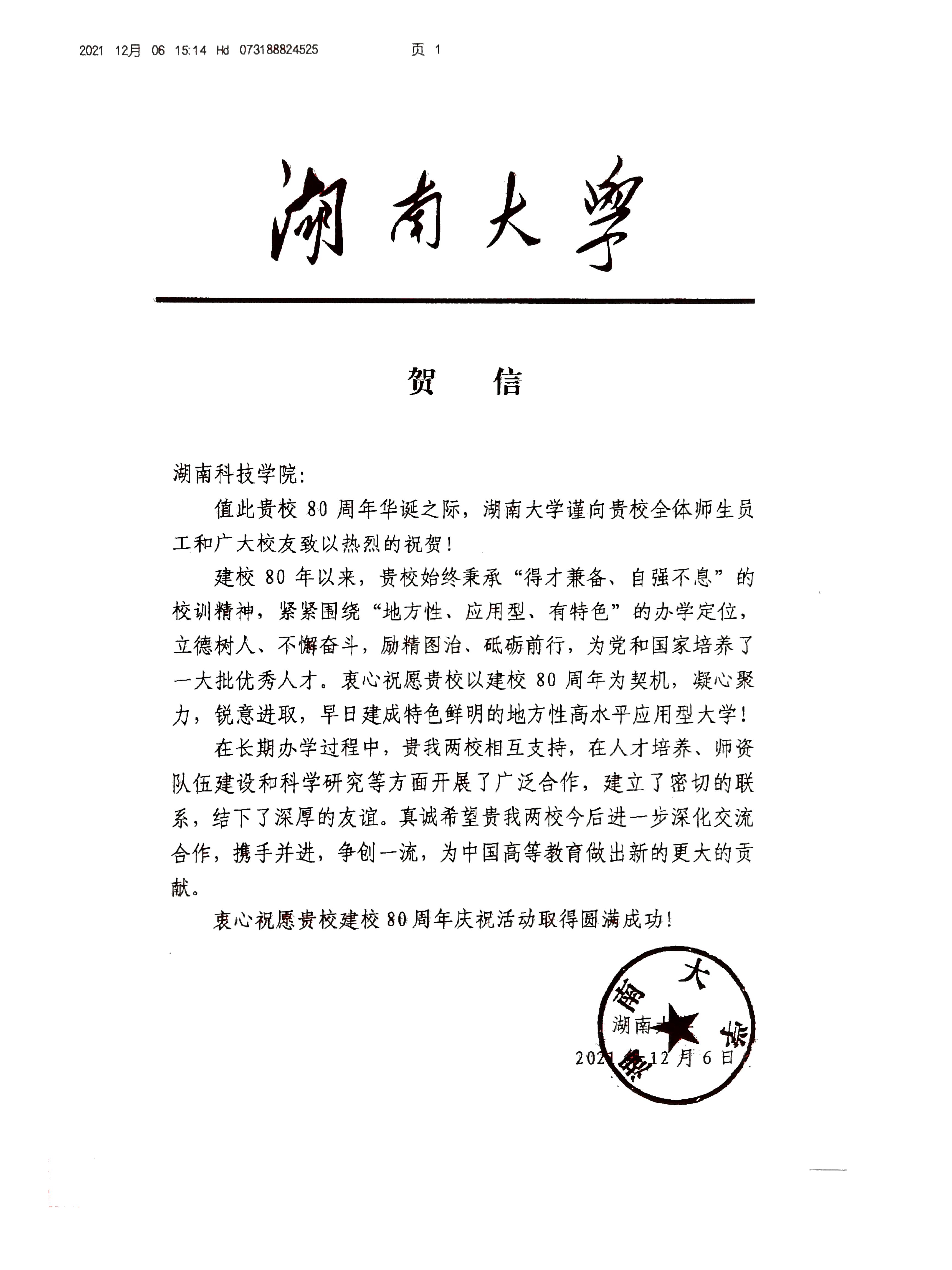 20211206给beat365英国官网校庆的贺信(湖南大学)
