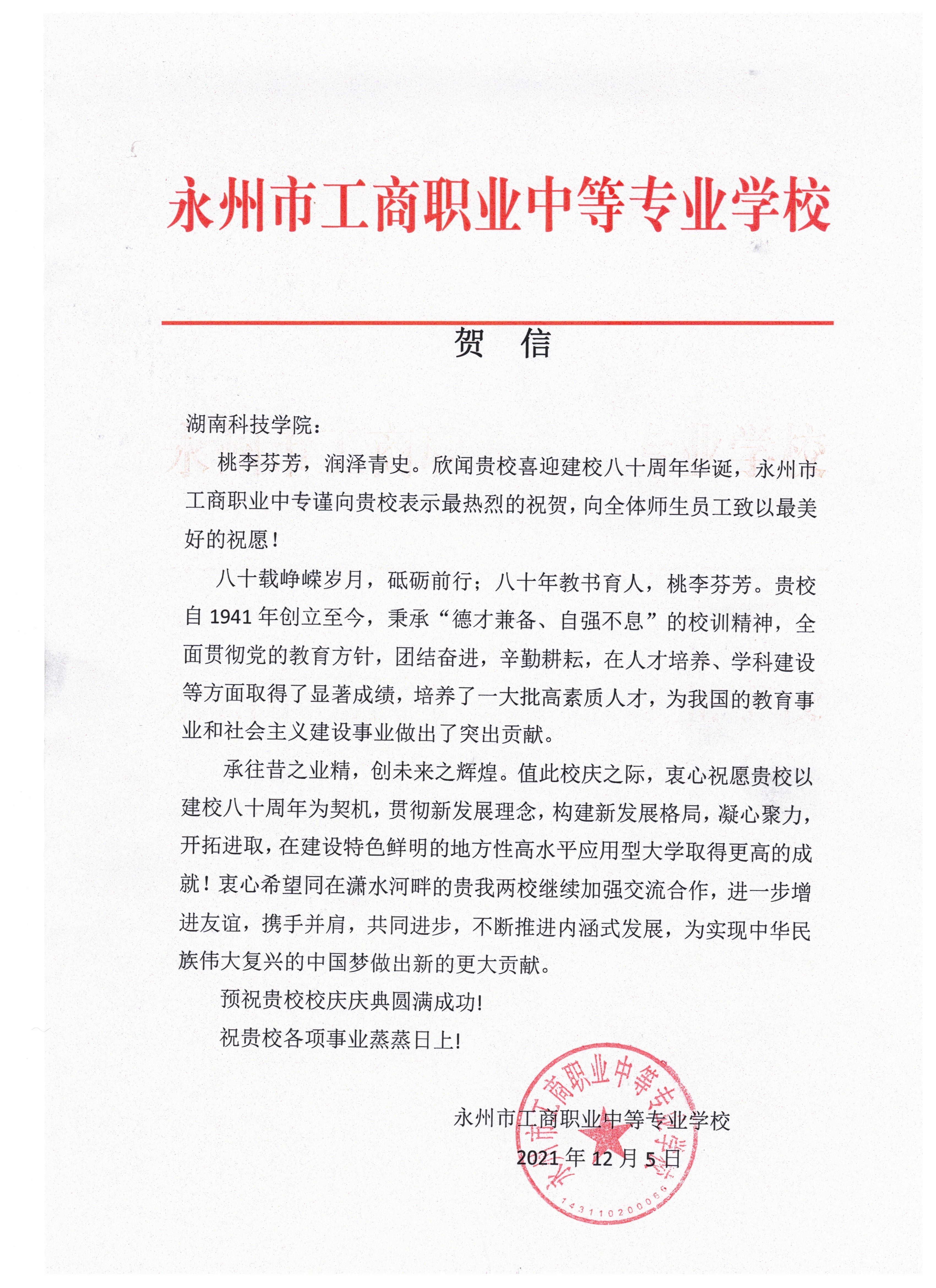 20211206给beat365英国官网校庆的贺信(永州工商职业中专学校)