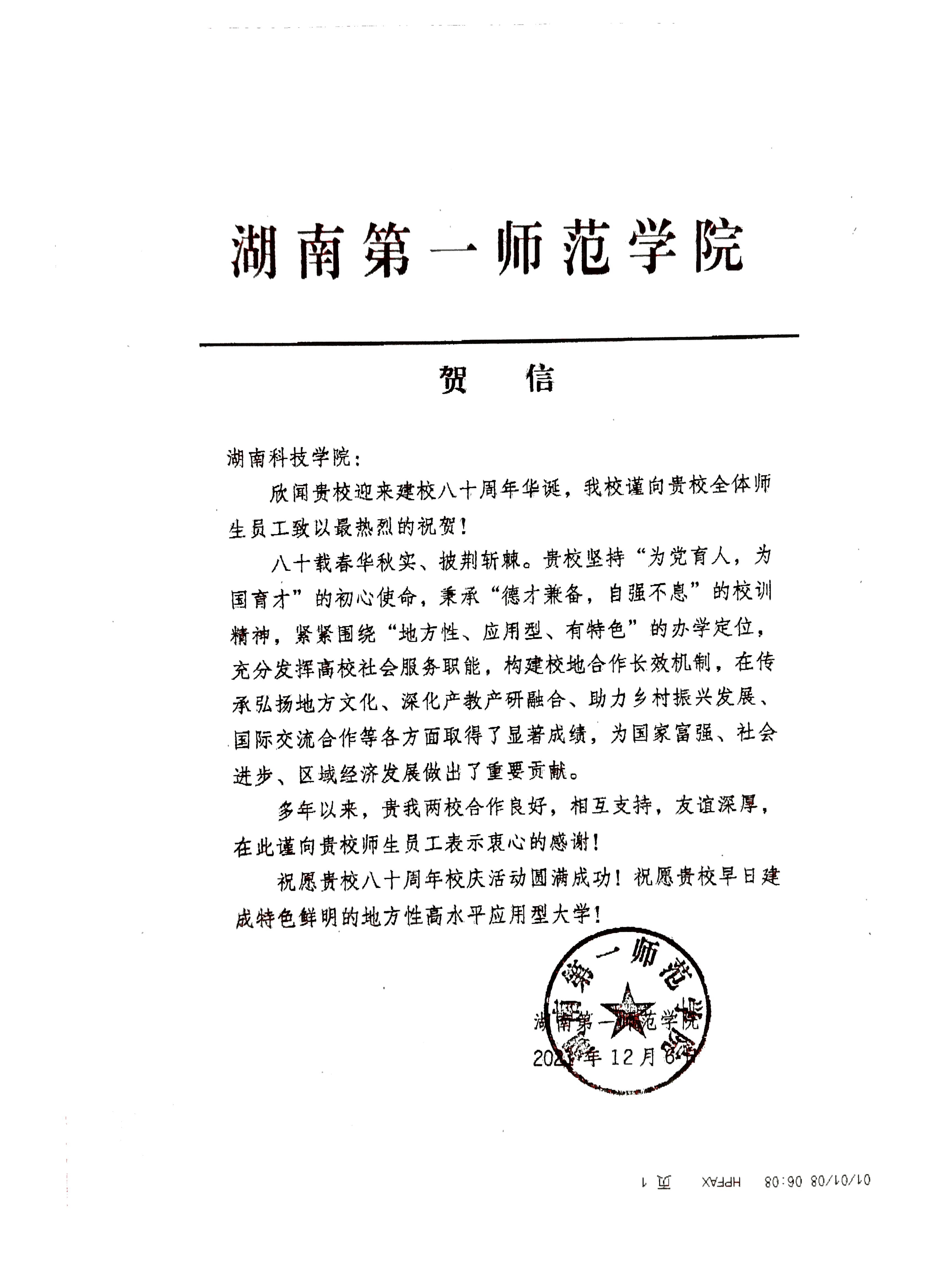 20211206给beat365英国官网校庆的贺信(湖南第一师范学院)