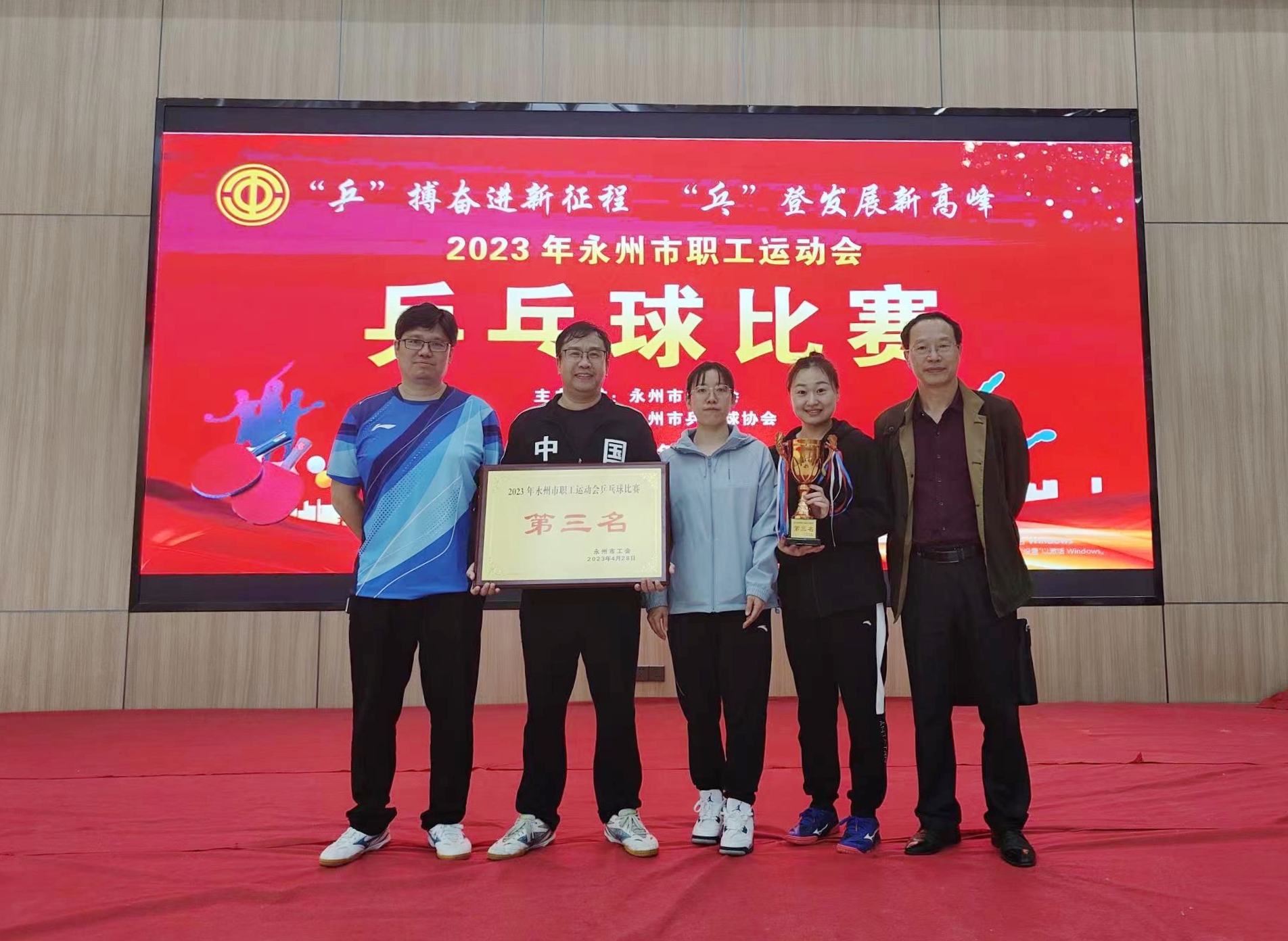 本网讯 4月26日至29日,2023年永州市职工运动会乒乓球比赛在市工人文化宫举行,共有来自全市40支队伍的200名选手参赛。beat365党委委员、副校长吴小林担任领队,工会常务副主席潘剑锋担任教练,石循忠、黎建军、欧红星、陈紫菁、苏阳阳积极参赛。在比赛中大家齐心协力,不畏强敌,努力拼搏,赛出风格,赛出成绩,经过分组循环、淘汰赛,最后斩获团体第3名。