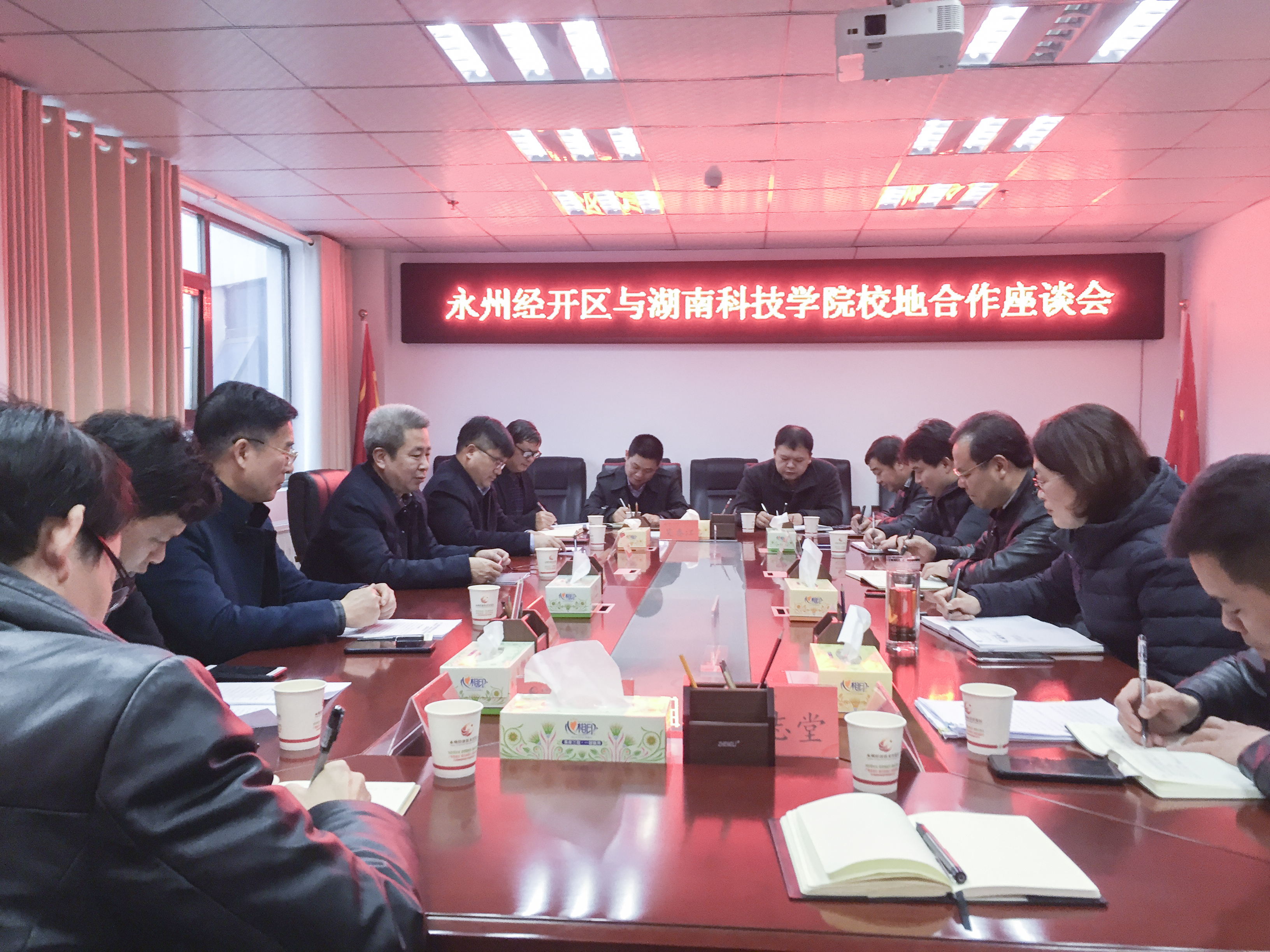 12月23日下午,党委书记曾宝成、校长李钢、副校长宋宏福带队前往永州经济技术开发区召开校地合作座谈会,洽谈合作共建事宜。永州经开区党委书记高守凯,党委副书记、管委会主任李瑛,副主任万李以及双方有关部门负责人参加会议。