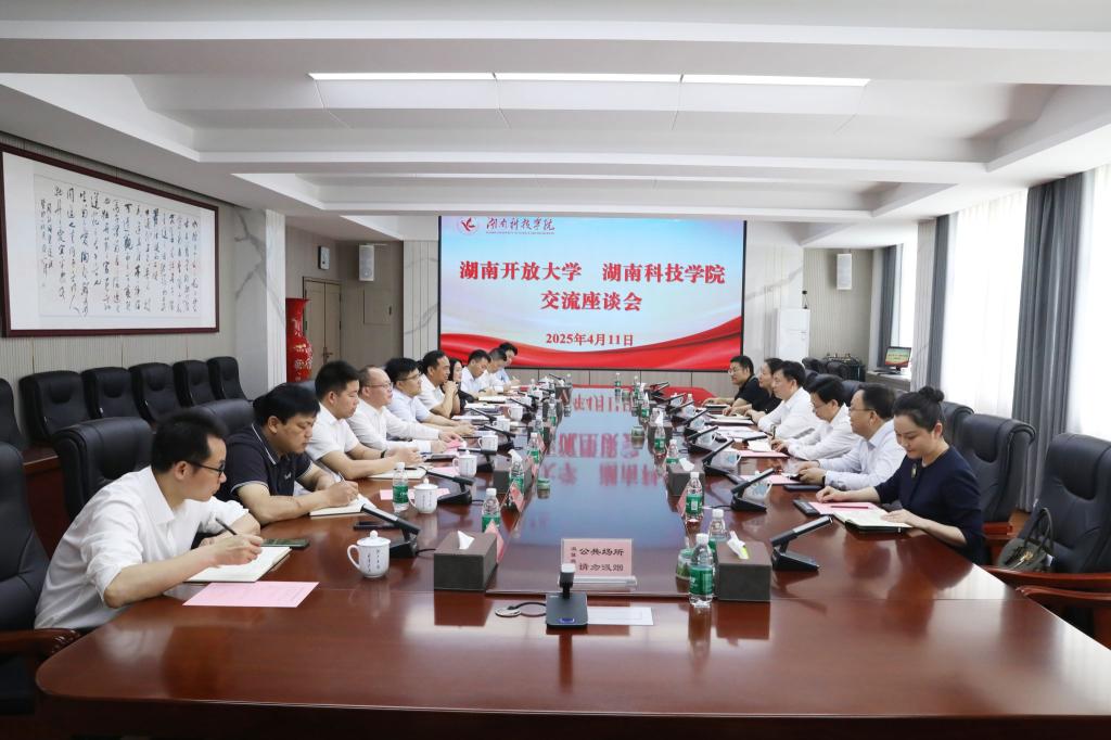 本网讯(记者谢志豪)4月11日,湖南开放大学党委书记龙献忠,副校长陈志国、梁晖来校交流,beat365党委书记李钢、校长黄创霞、副校长何海参加座谈交流,黄创霞主持座谈会。